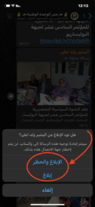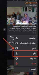 يتيح تطبيق “وات ساب” في كل الدردشات عند التوصل برباط او صورة او فيديو، فرصة للتبليغ عنه اذا كان المنشور غير مقبول او غير مرغوب فيه، يكفيك انك تحدد المنشور ثم تضغط عليه ضغطة مطولة فسوف يعطيك خيار التبليغ بإتباع الخطوات انظر الطريقة عبر الصور التالية: