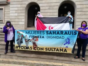 وفي الختام تم تنظيم وقفة أمام مبنى مندوبية الحكومة الكنارية حملت العلم الوطني و لافتة كتبت عليها عبارات تضامنية مع الجسورة “سلطانة سيد ابراهيم خيا”.