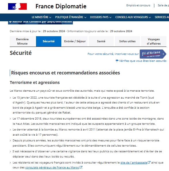 الخارجية الفرنسية | تحذر رعاياها في المغرب من تهديدات إرهابية محتملة، مباشرة بعد مغادرة الرئيس الفرنسي لهذا البلد في زيارة دامت 3 أيام.